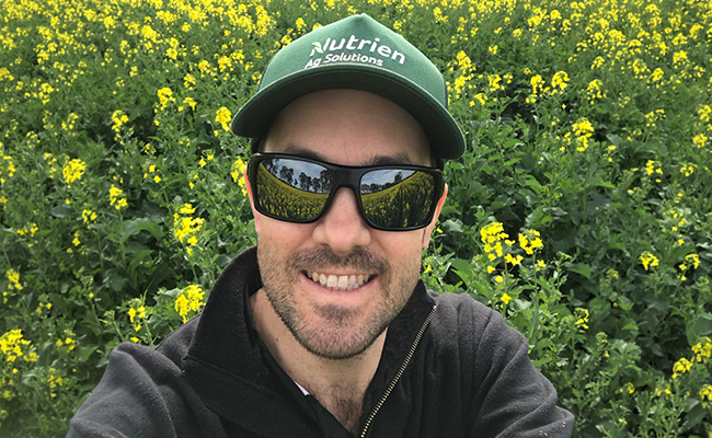 Agronomist with Nutrien at Elmore in Victoria, Chris Dunn, pictured in a local canola crop, says the ability to apply Tenet herbicide post-emergent in canola is helping to extend the life of clethodim herbicide and achieve improved weed control.